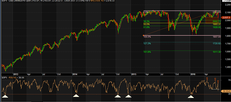 The white triangles in the chart below show how RSI of 28 has saved the market over the past two years. Therefore, I will watch this level carefully and should it not hold (like Aug 2015), then my next target for the S&P500 would be around the February lows of 1800.
