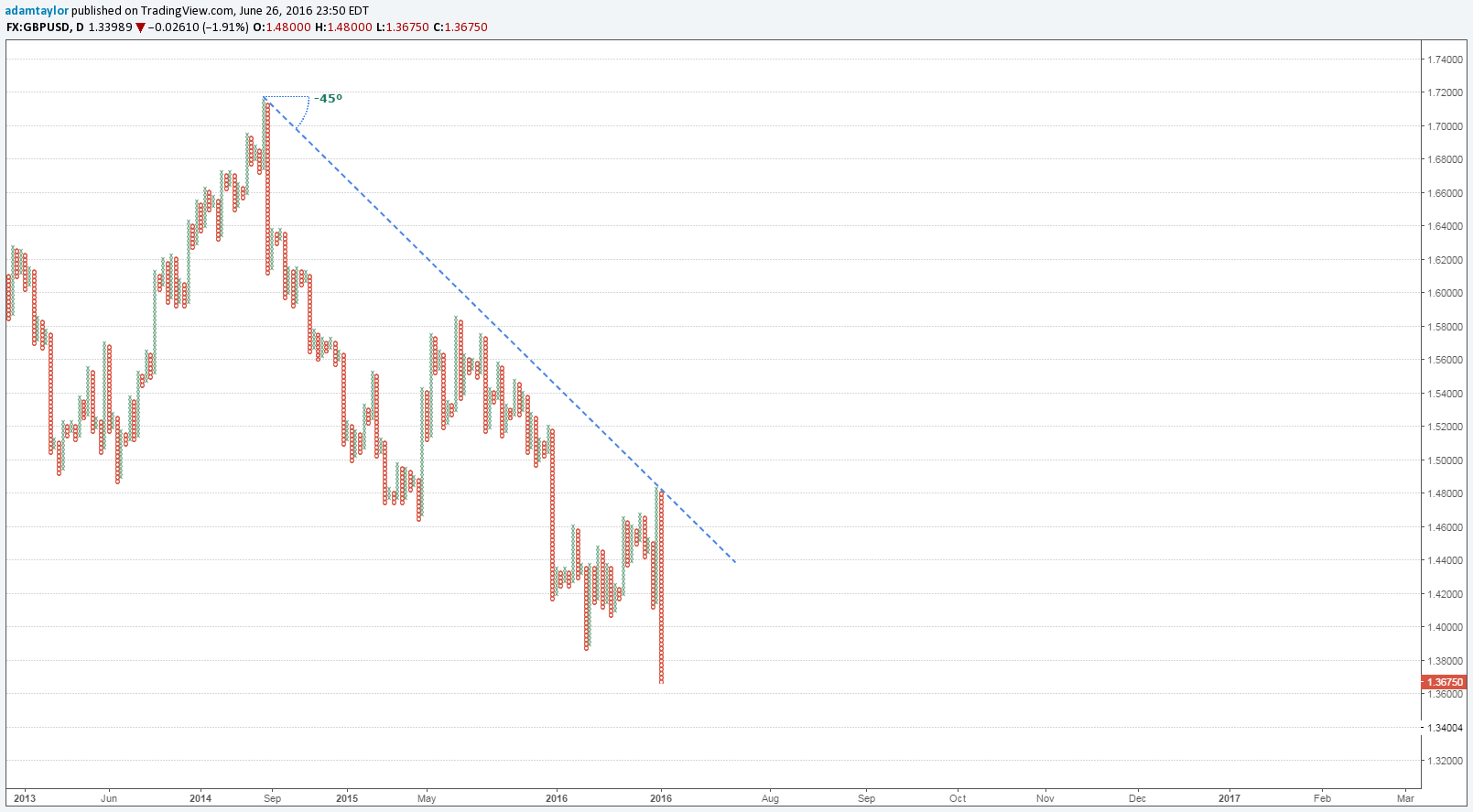 We saw an incredible 10% move from a high of 1.5017 down to a 30 year low of 1.3227. At this point, it becomes extremely difficult to assess when you have relatively little price action to compare it with.