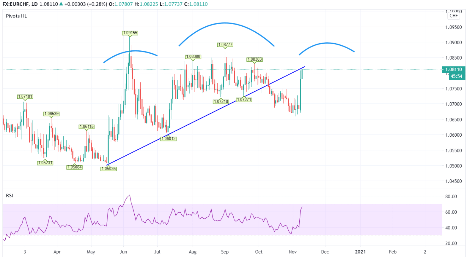 The daily chart above shows that EURCHF witnessed some aggressive buying activity in May from 1.06 up to 1.09 before retracing slightly. From the latest candle developments, we might be seeing a replay of this past behavior. Notice how the RSI indicator headed into heavily overbought territory in May, and we are starting to follow a similar pattern here in November. Now, of course, this may not be the case, but the characteristics are strikingly similar.